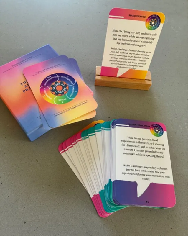 The 52-Week Authentic Practitioner Reset is a deck of 52 cards, which act as the companion deck to real world critical self-reflective practices or supervision. Each card offers a deeper, thought-provoking introspective question and is partnered with an action challenge prompt to help health and helping professionals to have focussed support to move them through from burnout and overwhelm to pulling back into better balance. Each card sits somewhere along the Stages of Change model to further support practitioners to reflect on where they might currently be experiencing a situation. The call to actions on each card offers activities and strategies for experiential and experimental learning, which we know has a higher chance of embedding change into people’s lives. Language is simple and clear, and each card is beautifully coloured to further symbolise humanity and change being dynamic and moving. We are not static, nor stuck or fixed. Connection Cards are ideal for health and helping professionals - individual workers, teams, leaders and supervisors.